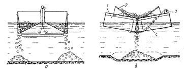 При больших объемах работ наиболее целесообразно применение саморазгружающихся плавсредств (рис.49, 50).Операция по разгрузке таких плавсредств производится в течение нескольких минут. Отрицательной особенностью устройства отсыпки таким способом является то, что сброшенный камень ложится отдельными буграми. Поэтому целесообразно при помощи саморазгружающихся плавсредств отсыпать нижнюю часть профиля, не доводя ее до проектной отметки на 0,5 м.