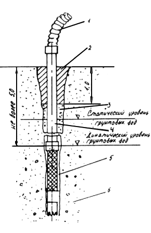 1 - гибкий шланг; 2 - глина; 3 - гравийно-песчаный заполнитель; 4 - иглофильтр; 5 - сетка фильтра; 6 - водоносный грунт