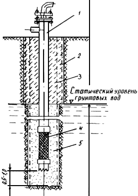 1 - эжекторный иглофильтр ЭИ-2,5; 2 - обсадная колонна, извлекаемая после установки фильтра; 3 - обсыпка (песок, супесь, суглинок, глина); 4 - фильтровое звено; 5 - фильтровая обсыпка (гравий, песок)