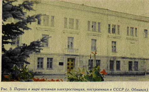 Применение ядерной энергии для преобразования ее в электрическую впервые было осуществлено в нашей стране в 1954 году. В городе Обнинске была введена в действие первая атомная электростанция (АЭС) мощностью 5000 кВт (рис.3). Современные АЭС имеют в сотни раз большую мощность. Энергия, выделяющаяся в ядерном реакторе, использовалась для превращения воды в пар, который вращал затем связанную с генератором турбину.
