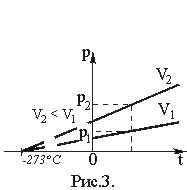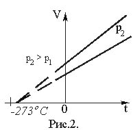 Изопроцесс, протекающий в идеальном газе, в ходе которого давление остается постоянным, называется изобарным. Зависимость объема газа от его температуры при постоянном давлении была установлена Л. Гей-Люссаком, который показал, что объем газа данной массы при постоянном давлении возрастает линейно с увеличением температуры (закон Гей-Люссака): V1/Т1= V2/Т2 V = V0·(1 + a·t), где V – объем газа при температуре t, °С; V0 – его объем при 0°С. Величина V = V0·(1 +1/273·t). Графически зависимость объема от температуры изображается прямой линией – изобарой (рис. 2). При очень низких температурах (близких к – 273°С) закон Гей–Люссака не выполняется, поэтому сплошная линия на графике заменена пунктиром.