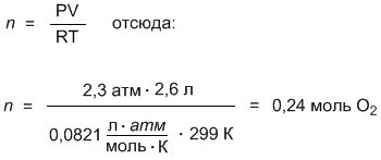 Уравнение называется уравнением Менделеева – Клапейрона и является основным уравнением, связывающим параметры газа в состоянии теплового равновесия. Поэтому его называют уравнением состояния идеального газа Пример решения задачи1. В колбе объемом 2,6 л находится кислород при давлении 2,3 атм и температуре 26 оС. Вопрос: сколько молей O2 содержится в колбе? Из газового закона найдем искомое число молей n: