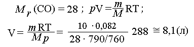 аналогично находим давление хлора (р2) при 273oС: р2 = 0,62 атм. Пример решения задачи 3. Чему равен объем, который занимают 10 г оксида углерода (II) при температуре 15oС и давлении 790 мм рт. ст.? Решение.