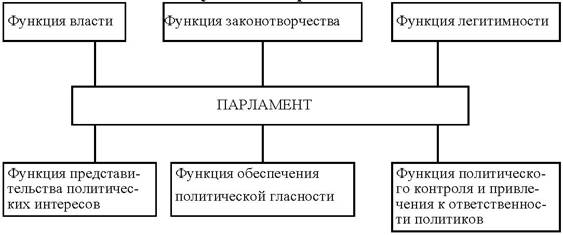 Законодательная власть представлена парламентом, который устанавливает законы разрабатывает и утверждает новые, дополняет, изменяет или упраздняет уже существующие. При демократии парламент осуществляет и функцию принятия важнейших политических решений. Будучи избранным непосредственно народом, он выступает выразителем народной воли и является по этой причине важнейшим легитимирующим органом.