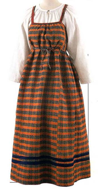 А холщовые белые рубахи северные крестьянки носили с сарафанами. В XVIII веке и в первой половине XIX века сарафаны делали из однотонной, цветной ткани: синего холста, бязи, красной крашенины, черной домотканой шерсти. Это подчеркивало яркую и узорную вышивку рубах и передников. Косоклинный покрой сарафана имел несколько вариантов. Наиболее распространенным был сарафан со швом посередине переда, отделанным узорными лентами, мишурным кружевом и вертикальным рядом медных и оловянных пуговиц.
