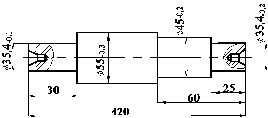 Считаем, что заготовка (прокат, сталь 40, Ø 60мм) поступила на обработку с предварительно обработанными торцами, центровыми отверстиями и предварительно обработанной шейкой вала Ø 35,4-0,2 х 25 с припуском под чистовую обработку (Ø 37) и шейкой Ø 45-0,2 х (60 – 25) также с припуском под чистовую обработку (Ø 46).