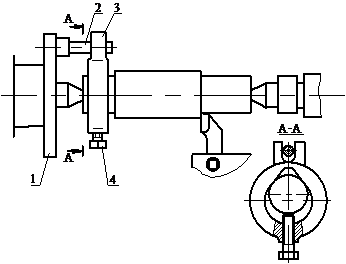 Передача вращения в этом случае осуществляется поводковым патроном 1 через палец – поводок 2 хвостовику 3 хомутика, который крепится на детали винтом 4.