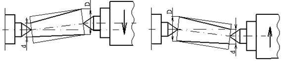 Как в первом, так и во втором случае необходима проверка соосности осей вращения шпинделя и вращающегося центра с целью исключения конусообразности при точении цилиндрических поверхностей. Проверка соосности выполняется либо посредством совмещения вершин центров установленных в шпинделе и пиноли задней бабки, либо посредством проверочных проходов резцом в заданном положении каретки суппорта (координата Х) по лимбу: диаметр у патрона и вблизи центра задней бабки должны быть одинаковыми. В случае наличия разности диаметров необходимо произвести смещение задней бабки в направлении, снижающем эту разницу согласно схеме (рисунок 4) до устранения этой разности.