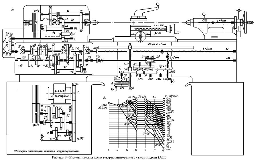 3) Настройка направления перемещения суппорта на станке мод. 1А616 обеспечивается реверсным устройством с перемещаемой шестерней Z = 34 в шпиндельной бабке. Положение шестерни, показанное на кинематической схеме (рисунок 6), соответствует наиболее распространенному перемещению суппорта справа налево.