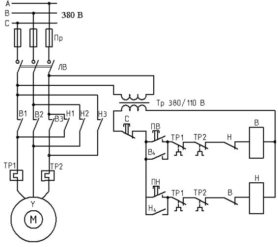 Силовая часть цепи и цепь управления запитывается от трехфазной сети напряжением 380 В через систему предохранителей Пр и линейный выключатель ЛВ. С целью повышения уровня безопасности цепь управления запитана через понижающий трансформатор.