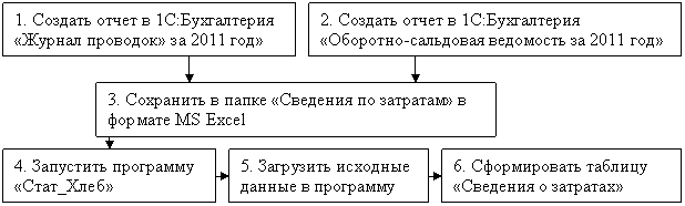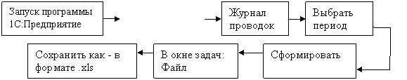 Для автоматического заполнения разработанной нами таблицы «Сведения о затратах на производство продукции в пищевой отрасли» необходимы данные из программы «1С: Предприятие –Бухгалтерский учет». Мы предлагаем использовать 2 документа – это «Оборотно-сальдовая ведомость» и «Журнал проводок» за предшествующий год. Для этого в программе «1С-Бухгалтерский учет» выполним ряд операций (Рисунок 6).