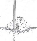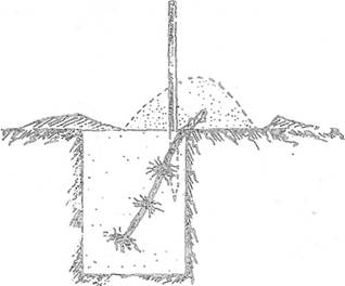 Вешки на местах, где должны копаться ямы, устанавливаются над центрами будущих ям, но целесообразнее копать каждую яму рядом с вешкой, с южной стороны от нее. Когда яма будет готова, вешку наклоняют в ее сторону, намечая в закрайке ямы небольшую выемку.