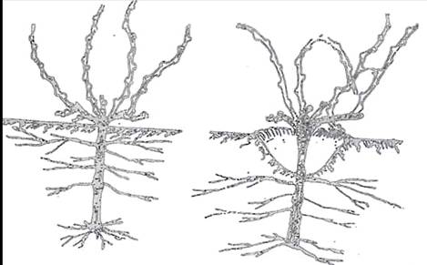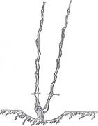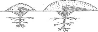 В степной зоне при этом следует удалять и те корни, которые образовались в верхнем слое почвы, для чего вокруг саженца нужно делать лунку глубиною в 25 сантиметров, корни обрезать, а стволик оставлять в таком открытом виде до осени (рис. 8). Этот прием называется катаровкой, он и в дальнейшем повторяется ежегодно при весеннем открытии лоз. Задача катаровки состоит в том, чтобы помешать кусту развивать поверхностные корни, которые в суровую зиму гибнут в первую очередь. Кусты, обладающие более углубленной корневой системой, легче переносят такие зимы. Катаровка способствует усилению развития глубоких корней и совсем лишает куст поверхностных корней.