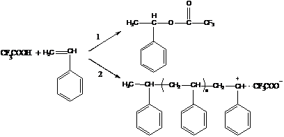 Роль среды в катионной полимеризации можно проиллюстрировать следующим примером. При взаимодействии трифторуксусной кислоты со стиролом процесс может протекать по двум направлениям.