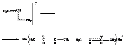 Этот комплекс легко отдает электрон мономеру, давая соответствующий анион-радикал M∙-, последние быстро рекомбинируют, образуя дианионы: