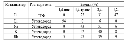 Приведенные данные показывают, что стереоспецифический эффект наблюдается только при полимеризации изопрена в углеводородной среде на литиевом катализаторе. Этот эффект связан с относительно высокой склонностью иона лития к образованию координационных связей, что отличает его от ионов Na, K и Rb.