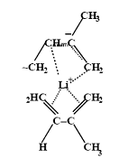 Если проводим анионную полимеризацию в полярном растворителе (например, тетрагидрофуране) с помощью алкилов лития или натрия, то получим атактические структуры в основном с 1,2-присоединением. Проведение этой же полимеризации в неполярном растворителе приводит к образованию полибутадиена с 1,4-присоединением. При полимеризации изопрена в тех же условиях получаются 1,4-цис-полиизопрен. Возможность стереорегулирования объясняется тем, что во втором случае существует ионный ассоциат, не сольватированный неполярным растворителем, димеры или более сложные n-меры (тетрамеры, гексамеры, и т. д.):