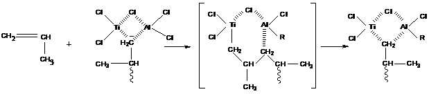 Наиболее известной системой является AlR3·TiCl3, где на поверхности кристалла TiCl3 образуется его комплекс (соединение) с AlR3, который является активным центром полимеризации. В случае пропилена (наиболее практически важный случай) можно получить изотактический полипропилен. Механизм процесса можно представить схемой: