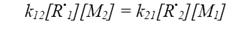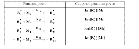 где Мi — мономер i-ого типа; ~R∙j — макрорадикал, оканчивающийся звеном Mj, а kij — константа скорости присоединения Мj мономера к радикалу ~R∙i. Рассматриваемая модель получила название "модель концевого звена" сополимеризации. Кинетическая обработка приведенной реакционной схемы в квазистационарном приближении позволяет установить связь между составом сополимеров и составом исходной смеси мономеров. В квазистационарном состоянии концентрации радикалов ~R∙1 и ~R∙2 постоянны, т. е. скорости перекрестного роста цепи равны между собой: