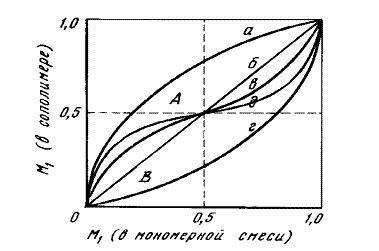 Зависимость состава сополимеров от состава смеси мономеров удобно характеризовать диаграммой "состав мономерной смеси - состав сополимера" (рис. 12.1.1.). Форма кривых на диаграмме составе зависит от значений r1 и r2. При этом возможны следующие случаи: 1) r1=r2=1, т. е. для всех соотношений концентраций мономеров в реакционной смеси состав сополимера равен составу исходной смеси (прямая б), 2) r1>1 и r2<1, т. е. для всех соотношений концентраций мономеров в исходной смеси сополимер обогащен звеньями М1 (кривая а), 3) r1<1 и r2>1, т. е. для всех исходных соотношений концентраций мономеров сополимер обогащен звеньями М2 (кривая г), и наконец, 4) r1<1 и r2<1, т. е. при малых содержаниях M1 в исходной смеси мономеров сополимер обогащен звеньями М1, а при больших — звеньями M2 (кривые в и д). В последнем случае наблюдается склонность к чередованию в сополимере звеньев М1 и М2, которая тем больше, чем ближе к нулю значения r1 и r2. Случай r1>1 и r2>1, которому должна соответствовать тенденция к раздельной полимеризации мономеров в смеси, обычно на практике не реализуется.