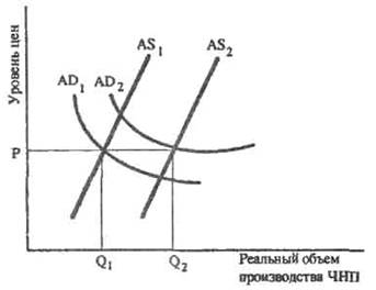 Согласно монетарному правилу, увеличение совокупного спроса с AD1 к AD2 (рис.2) будет соответствовать увеличению совокупного предложения с AS1 до AS2 и уровень цен останется постоянным.