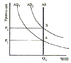 Теория рациональных ожиданий предполагает, что кривая совокупного предложения вертикальна. Расширение совокупного спроса с AD1 к AD2 вызовет рост уровня цен с Р1 до P2, а реальный объем производства в стране останется неизменным на уровне Q1.