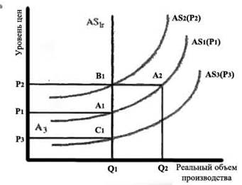 В краткосрочном плане рост уровня цен с Р1 до Р2 приведёт к смещению экономики от A1 к A2. После повышения номинальной зарплаты кривая краткосрочного совокупного предложения сместится влево от AS1 к AS2. Кривая отражает более высокий уровень цен Р2 и переведет экономику из А2 в B1. реальный выпуск упадет, но безработица вернется к естественному уровню. Падение цен и понижение зарплаты приведет к сдвигу из точки A1к C1. Проводя линию между точками долгосрочного равновесия A, B1, C1 мы получим кривую долгосрочного совокупного предложения. Она имеет вид вертикальной прямой при уровне производства равном потенциальному Qf.