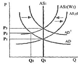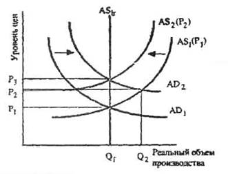 Рост совокупного спроса от AD1 к AD2 повлечет рост уровня цен до Р2 и увеличения объёма производства до Q2. Но в долгосрочном плане номинальная зарплата увеличивается и совокупное предложение сместится влево к AS2. Реальный объем производства вернется к своему первоначальному уровню Qf, а цены поднимутся до уровня Р3.