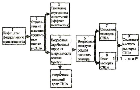 Значительное число экономистов согласны с тем, что крупные дефициты 80-х годов имели последствия, показанные на этой схеме. Снижение чистого экспорта оказывает сдерживающее воздействие на экономику США.