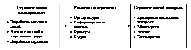 Процесс стратегического управления может быть описан как логический, систематический подход к созданию главных решений в организации. Выделяются три стадии стратегического управления: стратегическое планирование, реализация стратегии, стратегический контроль (рис. 3).