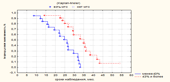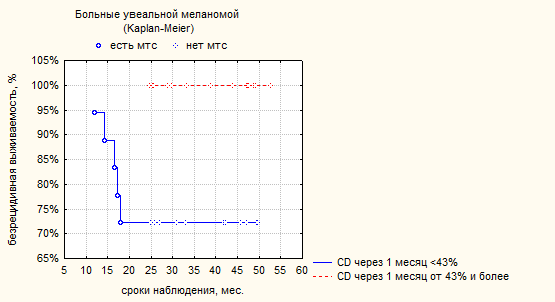 На рисунке 1 представлены сроки безрецидивной выживаемости у больных увеальной меланомой в группе А1 с прогностическим уровнем СD выше или ниже 43% через 1 месяц после ксеновакцинации. На графике видно, что у пациентов с низким иммунным ответом (т. е.< 43%) чаще, чем у пацентов с хорошим иммунным ответом (т. е. > 43%), развивлись метастазы.