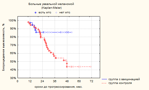 В группе больных УМ без ксеновакцинации (группа А2больных УМ (группа контроля) медиана безрецидивной выживаемости 45,8 мес. (менее 4 лет)
