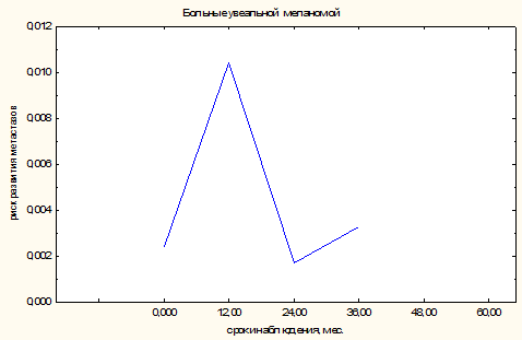 На рисунке 3 представлен временной график риска развития метастазов у больных увеальной меланомой в группе А1 (с ксеновакцинацией). Как видно максимально высокий риск развития метастазов был зарегистрирован в сроки от 1 года до 3 лет наблюдения.