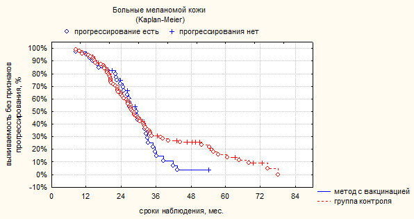 У больных меланомой кожи В2, не получавших ксеновакцинацию, медиана срока до прогрессирования составила 28,1 месяца.