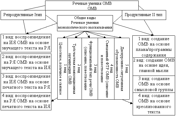 Типология умений образного монологического высказывания разработана с учётом репродуктивности и продуктивности высказывания, двух речевых типов, описания и повествования, связи с аудируемым или читаемым дискурсивным фрагментом, взаимодействия двух языков, диалогичности.
