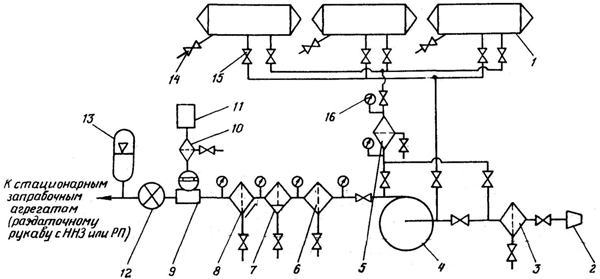 12 - счетчик-литрометр; 13 - гидроамортизатор; 14 - краны для слива отстоя топлива; 15 - задвижка; 16 - манометры