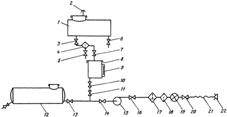 15 - насос; 17 - фильтр-сепаратор; 18 - фильтр тонкой очистки; 19 - счетчик-литрометр;
