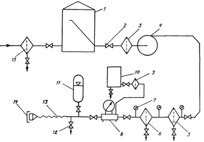 1 - резервуар; 2 - задвижка; 3 - фильтр сетчатый; 4 - насос; 5 - фильтр-сепаратор с краном слива отстоя;