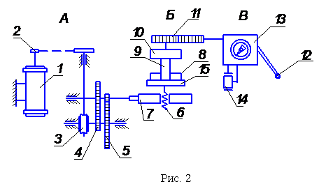 В – силоизмерительный узел. Для измерения крутящего момента машина снабжена маятниковым силоизмерителем. Момент, передаваемый верхнему захвату, вызывает отклонение маятника 12 до тех пор, пока создаваемый маятником момент не уравновесит момент, воспринимаемый образцом от привода машины. При отклонении маятник перемещает зубчатую рейку, приводящую во вращение шестерню, связанную с круговой шкалой величин крутящих моментов 13.