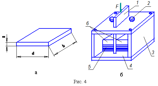 Для испытания древесины на перерезание поперек волокон применяют образец и приспособление, изображенные на рис. 4 а, б.
