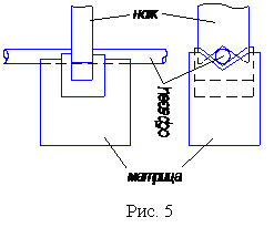 Матрицу устанавливают на опорную плиту нижнего захвата универсальной испытательной машины УММ-5. Нож должен совпадать с вырезом матрицы. При сближении захватов машины опорная плита верхнего захвата давит на нож, который входит в вырез матрицы и перерезает образец по двум плоскостям (рис. 6).