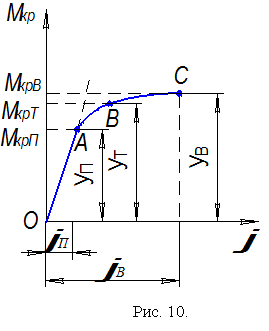 На диаграмме кручения стали (рис. 10) так же, как и на диаграмме растяжения, отмечают наклонный прямолиненйный участок ОА, соответствующий напряжениям, не превышающим предела пропорциональности, и криволинейный участок АВС, на котором закон Гука не выполняется.