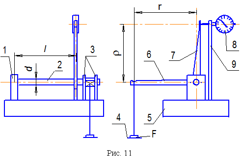 Испытания проводятся на опытной установке, изображенной на рис. 11. Испытываемый стальной вал 2 левым концом жестко защемлен в опоре 1 и шарнирно оперт в опорах 3. На валу жестко закреплены грузовой рычаг 6, на котором подвешен поддон для грузов 4 и толкатель 7, в пятку которого упирается наконечник индикатора часового типа 8. Индикатор крепится в держателе 9.