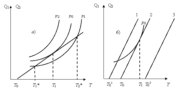 Рис. 2. Зависимость скорости тепловыделения Q1 и скорости теплоотдачи Q2 от температуры: а) при различных давлениях р1 > р0 > р2; б) при различных температурах стенки