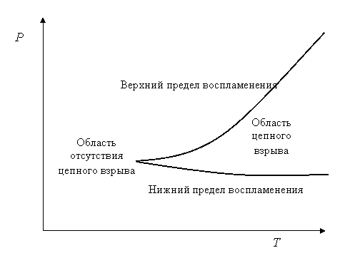 Верхняя и нижняя кривая образуют верхний и нижний пределы воспламенения. При условиях выше верхнего предела или ниже нижнего предела воспламенение невозможно.