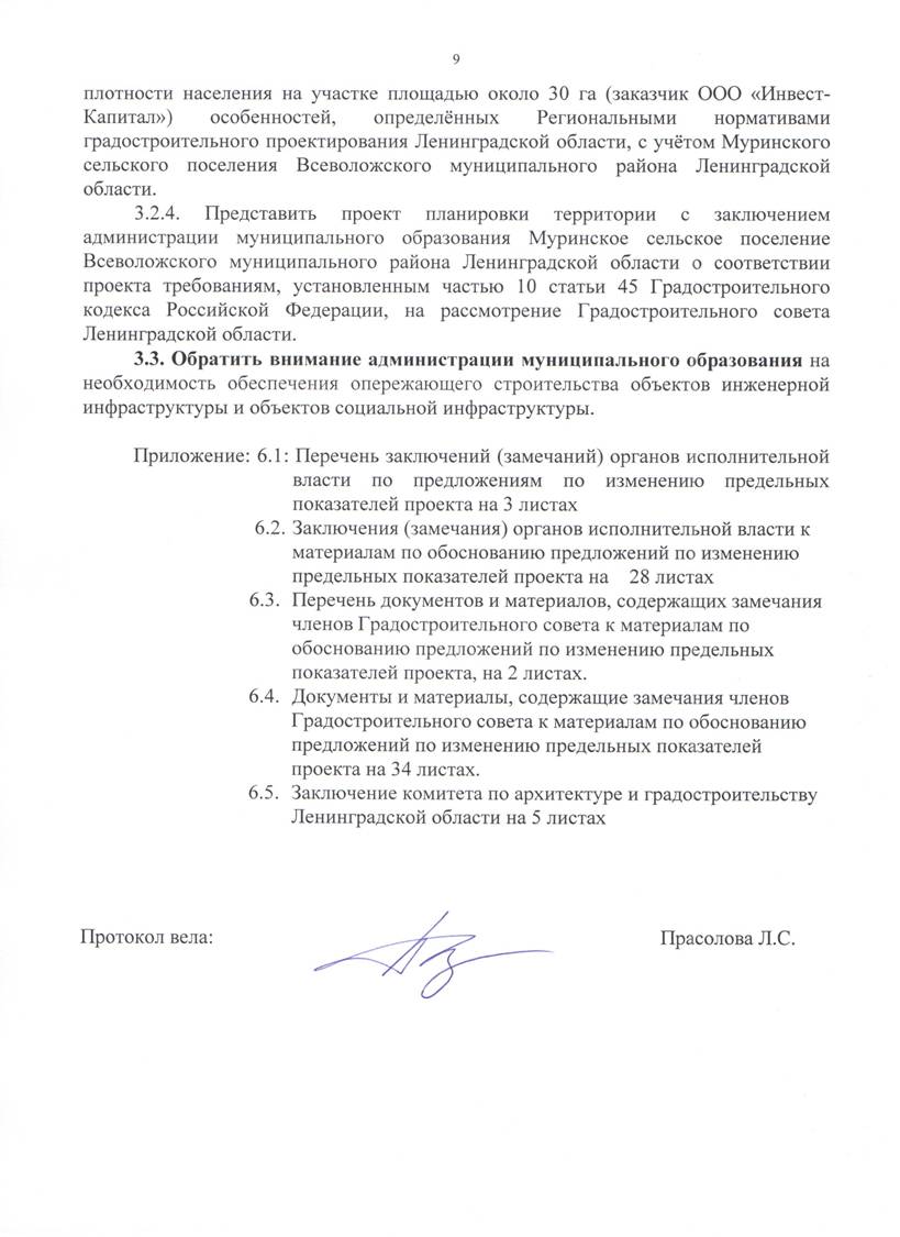 2.2.4. Представить проект планировки территории с заключением администрации муниципального образования Муринское сельское поселение Всеволожского муниципального района Ленинградской области о соответствии проекта требованиям, установленным частью 10 статьи 45 Градостроительного кодекса Российской Федерации, на рассмотрение Градостроительного совета Ленинградской области.