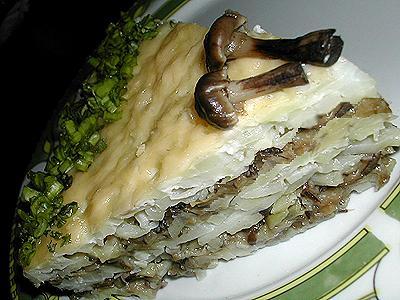 Укладывать послойно картофель и грибы (3 слоя картофеля и между ними 2 слоя грибов).