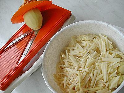 Картофель почистить и натереть на самой крупной тёрке. (Лучше всего использовать тёрку "Бёрнер" - вставка с ножами 3,5 миллиметра.)