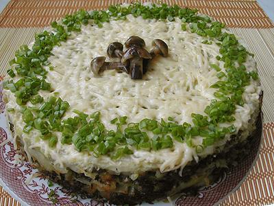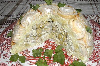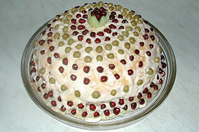 Весь купол промазать тонким слоем свежего майонеза и украсить зернами граната и зеленым горошком. (Если салат украсить сразу после приготовления и оставить пропитываться на несколько часов, зеленый горошек высохнет и сморщится.)