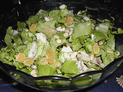 Смешать мясо, изюм, орешки и салат. Полить заправкой.